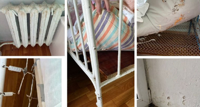 Жительница Волгограда сделала несколько фотографий, на которых показано плохое состояние кроватей, в частности у одной из них лопнула сетка, у другой отошла на ножке краска. Также на фото показана плесень на подоконнике и изношенный матрас.