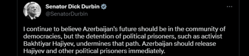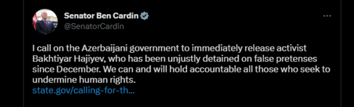 "Я по-прежнему считаю, что будущее Азербайджана должно быть в демократическом сообществе, но задержание политических заключенных, таких как активист Бахтияр Гаджиев, подрывает этот путь. Азербайджан должен немедленно освободить Гаджиева и других политзаключенных", - написал он в Twitter.