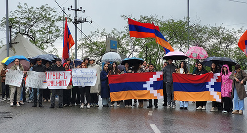 Молодые люди стояли с плакатами: "Незамедлительно убрать незаконный КПП", "Арцах принадлежит арцахцам", "Нет этнической чистке Арцаха". "Мы решили участвовать в акции и подготовили флаги и плакаты с нашими призывами. Арендовали микроавтобус, чтоб приехать. К сожалению, погодные условия помешали – холод и дождь не позволили нам долго стоять. Но мы повторим нашу инициативу", – рассказала корреспонденту "Кавказского узла" участница акции Гаяне Арутюнян.