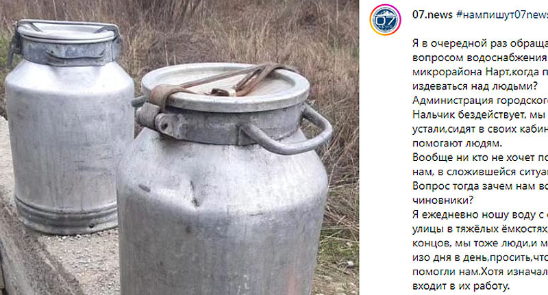 На проблему с водоснабжением также пожаловались и жители Нальчика. "Я в очередной раз обращаюсь с вопросом водоснабжения микрорайона "Нарт" Администрация городского округа Нальчик бездействует, мы уже устали, сидят в своих кабинетах и не помогают людям. Вообще никто не хочет помогать нам, в сложившейся ситуации. Вопрос тогда зачем нам все эти чиновники?" – задался вопросом один из местных жителей, обращение которого было опубликовано 6 мая в Instagram-паблике* 07.news.