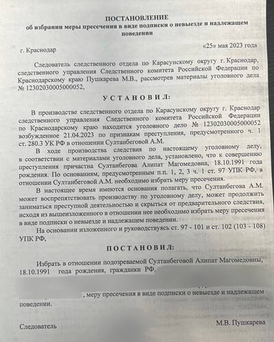 Источник разместил сегодня в своем телеграм-канале фотокопию постановления следователя М. В. Пушкаревой об избрании меры пресечения в отношении Алипат Султанбеговой, подозреваемой по части 1 статьи 280.3 УК РФ .