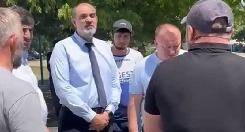 Между сельчанами и Кабардиевым идет перепалка. Он спрашивает одного из местных жителей: "Зачем ломаешь, откроют сейчас", судя пор всему, имея ввиду дверь, которая закрыта. Тот встречно задает ему вопрос: "Зачем закрыта". "Это наша школа, наши дети, не ваши", – сказал повышенным тоном еще один местный житель. "Все наши дети", – ответил ему Кабардиев.