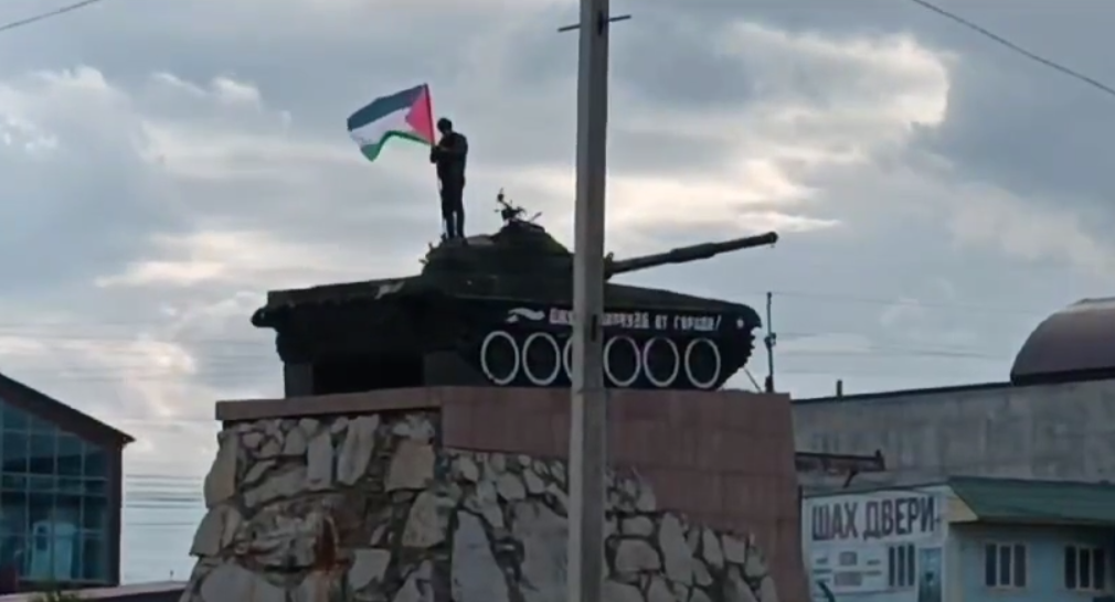 Видео, на котором мужчина установил на советском танке, расположенном в Хасавюрте, флаг Палестины, появилось сегодня в сети, в частности, его опубликовал Telegram-канал "Что там у дагестанцев".