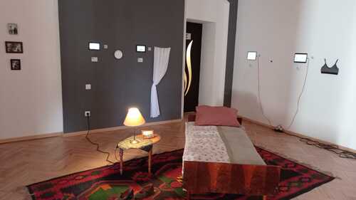Кроме того, на выставке представлено несколько семейных фотографий, на которых вырезаны изображения сбежавших женщин. В центре зала установлена кровать с тумбочкой и закрытыми жалюзи, символом того, что женщины практически ничего не видят кроме своего дома.