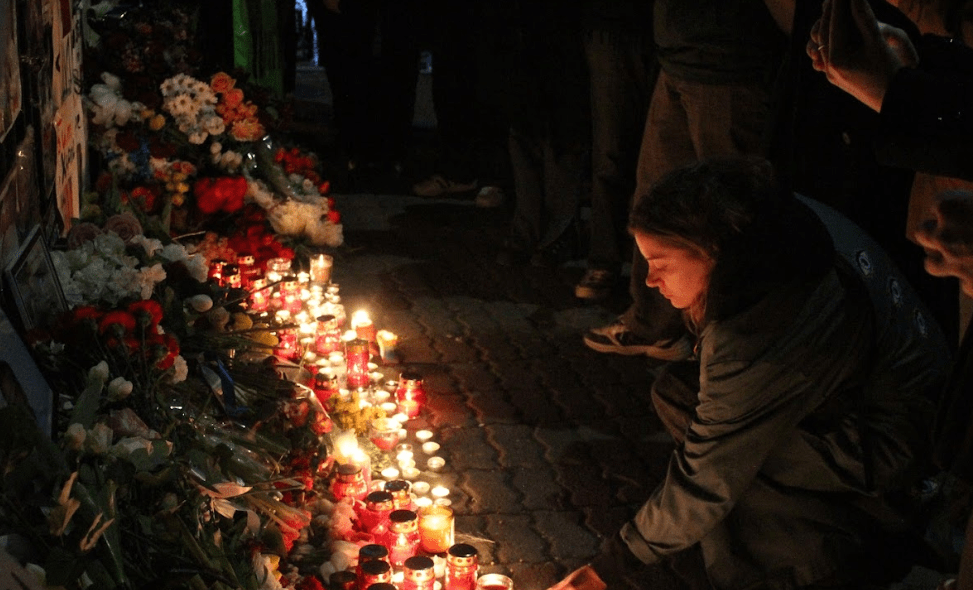 У стихийного мемориала. Фото Тиграна Петросяна для "Кавказского узла".Алексей Навальный был надеждой, что  есть люди, которые думают о России, а не о своем кармане, он был надеждой на лучшее [будущее], считает россиянка Елена. "У России два пути. Либо затихнуть и сидеть, как в средневековье, либо бороться и победить" - заявила она корреспонденту "Кавказского узла".