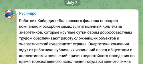 Энергетики компании "ждут от работника публичных извинений перед обществом и коллективом", подчеркивается в сообщении. "И пояснений причин недостойного поведения во время торжественного исполнения государственного гимна на официальном мероприятии в школе", - заявила пресс-служба группы компаний. По состоянию на 18.50 мск, в телеграм-канале "РусГидро" не опубликованы новые сообщения.