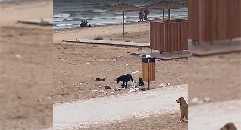 Видео, на котором показаны бродячие собаки и лежащий на земле мусор около урн на пляже Дербента, опубликовано сегодня в паблике "Мой Дербент 24" в соцсети "ВКонтакте".