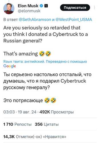 Дополнение от 12.10 мск Дословно Илон Маск заявил следующее "Ты серьезно настолько отсталый, что думаешь, что я подарил Cybertruck. русскому генералу? Это потрясающе". Так предприниматель ответил на реплику пользователя Set Abramson в соцсети X, заявившего, что "Маск поставляет автомобили, готовые к военному использованию, врагам Америки, находящимся под санкциями».