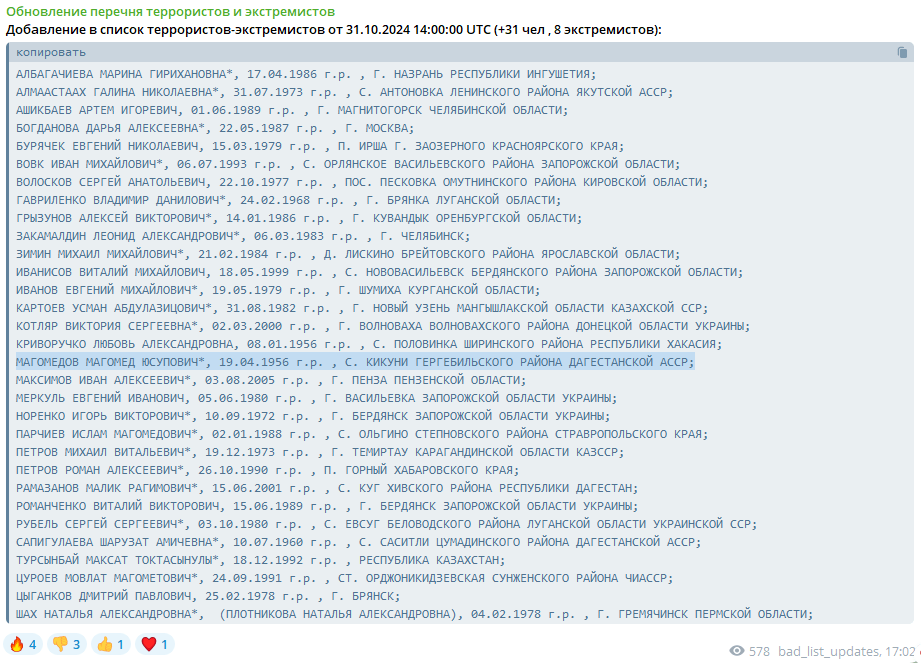 Данные 68-летнего Магомеда Магомедова, уроженца селения Кикуни Гергебильского района Дагестана, внесли в реестр террористов и экстремистов Росфинмониторинга 31 октября, следует из сообщения телеграм-бота, отслеживающего обновления списка.
