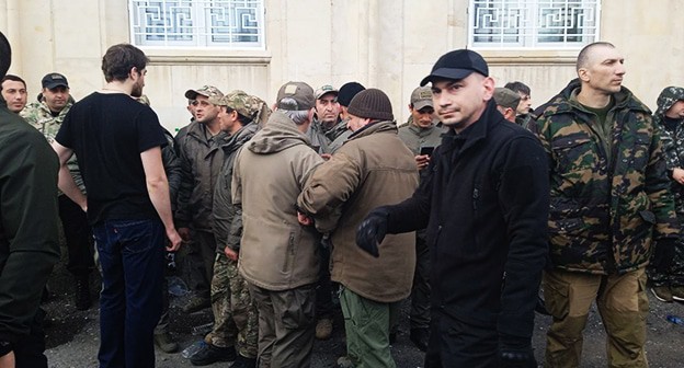 К участникам протестов у здания парламента Абхазии вышли глава Службы госбезопасности и министр внутренних дел. Протестующие окружили здание парламента и администрации президента.
