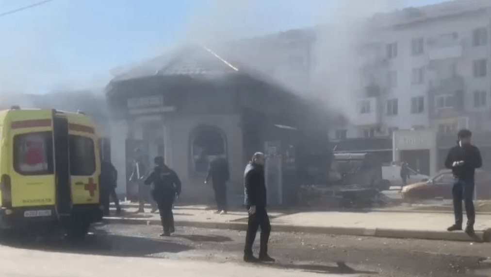 Как следует из видео, опубликованном в Telegram-канале Baza, в окне салона сотовой связи горит огонь, два человека лежат на земле, около них собрались мужчины.
