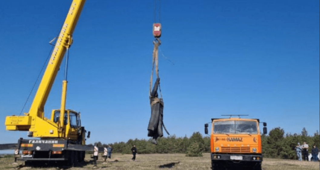 К сообщению приложены фотографии, на которых видно, как памятник снимают с постамента, а также лежащую в кузове грузовика скульптуру