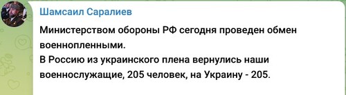 Сегодня Минобороны провело "обмен военнопленными", сообщил в своем телеграм-канале депутат Госдумы от Чечни, представитель парламентской координационной группы по вопросам СВО Шамсаил Саралиев. "В Россию из украинского плена вернулись наши военнослужащие, 205 человек, на Украину – 205", – написал он.