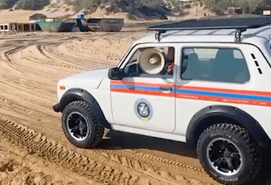 Машины с громкоговорителями, которые оповещают о запрете на купание на пляжах Анапы, ездят по песку, который много месяцев очищали и просеивали от мазута, указали пользователи Telegram.