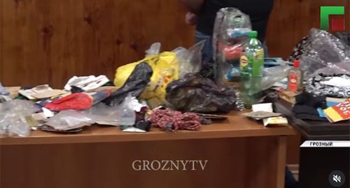 Как следует из видеозаписи, Эльжуркаев неоднократно указывает палкой на вещи, которые лежат на столе. В частности, там свечи, куски хозяйственного и туалетного мыла, ножницы, упакованные в магазинную обертку, много одежды, несколько бутылок алкоголя, кусок картона с надписью: "салфетки маленькие кухонные 17 штук", пластиковая канистра с водой, свечи, книги про шаманов и колдуний с изображениями, похожими на иллюстрации из детских книг.