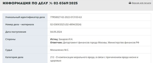 Новый иск с теми же основаниями поступил в суд в сентябре 2024 года, по делу прошло шесть заседаний. Суд частично удовлетворил иск, учтя размер ранее выплаченных Захарову компенсаций. "Согласно решению, за выплату компенсации будет отвечать столичный департамент финансов", - говорится в публикации.