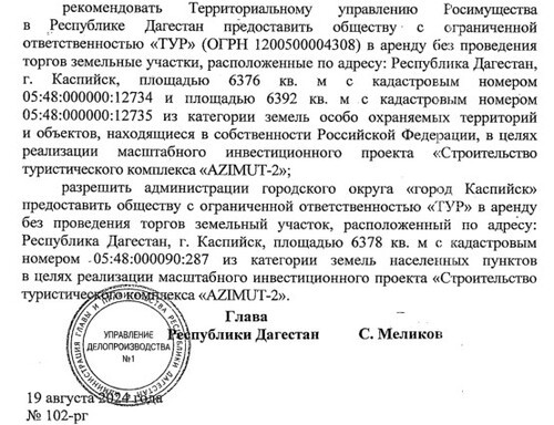 "Разрешить администрации городского округа "город Каспийск" предоставить обществу с ограниченной ответственностью "ТУР" в аренду без проведения торгов земельный участок, расположенный по адресу: Республика Дагестан, г. Каспийск, площадью 6378 квадратных метров [...] из категории земель населенных пунктов в целях реализации масштабного инвестиционного проекта "Строительство туристического комплекса AZIMUT-2", - говорится в распоряжении.
