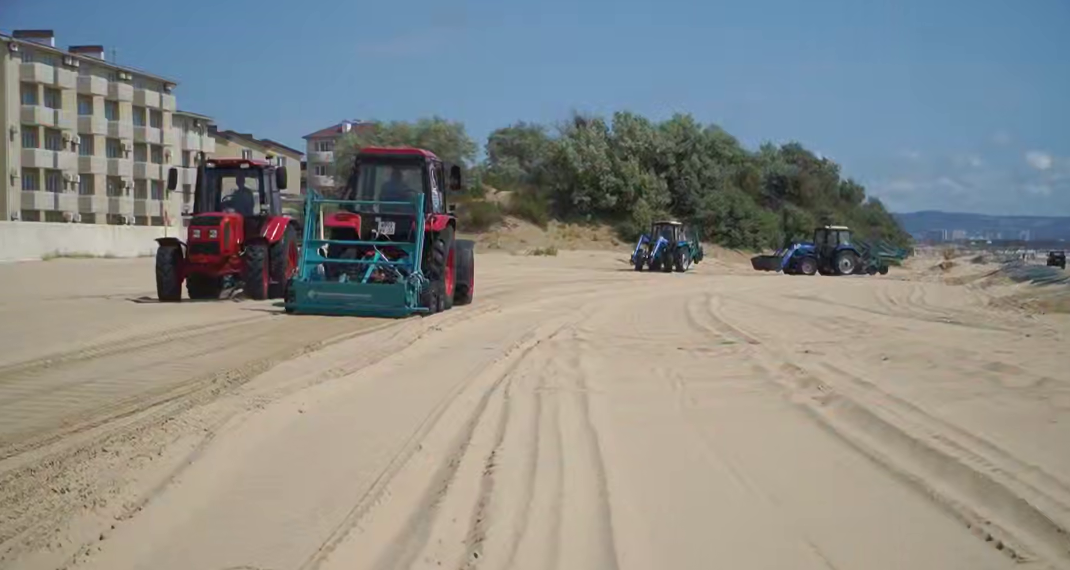 Техника сначала многократно просеивает верхние слои песка и убирает оттуда загрязнения. Затем переворачивает грунт на глубину до 70 сантиметров, его выравнивает, просушивает и еще раз просеивает для того, чтобы убрать загрязнения, которые могут находиться на глубине, говорится в сообщении в Telegram-канале оперштаба.