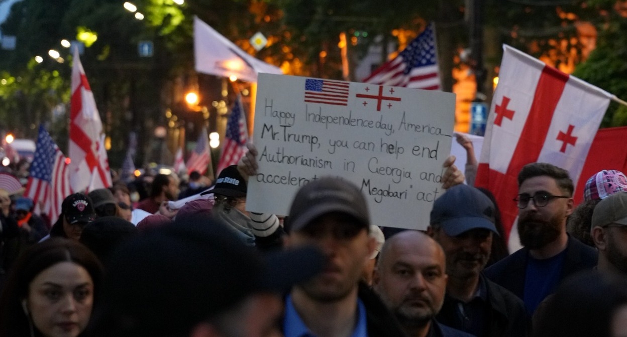 Акцией под лозунгом: "USA, Make Georgia Great Again" "протестующие подтвердили стратегическую дружбу между странами и выразили поддержку MEGOBARI Act", отмечает Telegram-канал Tbilisi life.