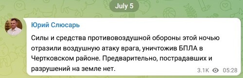 "По предварительным данным, пострадавших и разрушений на земле нет", - написал он в 05.28 мск.