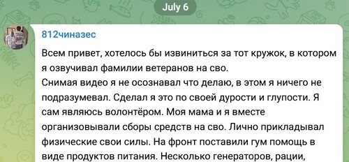 В своем телеграм-канале "812чиназес" (209 подписчиков) 6 июля молодой человек извинился за свое видео. "Сделал я это по своей дурости и глупости", - отметил он. По его словам, он сам является волонтером, собирает средства на СВО, отправлял на фронт гуманитарную помощь в виде продуктов питания, а также генераторы, рации, телевизоры.