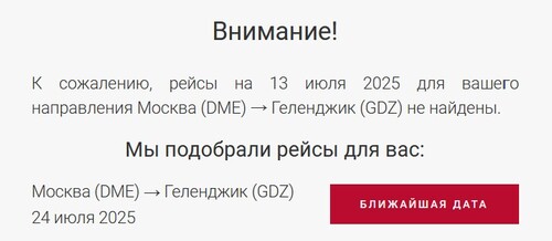 Согласно данным на сайте авиакомпании "Уральские авиалинии", ближайший рейс U6-115 из Москвы в Геленджик запланирован на 13.20 мск 24 июля. Стоимость билета в зависимости от класса варьируется от 19259 рублей до 45254 рублей.