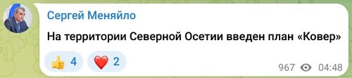 В Северной Осетии введен режим "беспилотной опасности", сообщил Сергей Меняйло в 04.38 мск в своем телеграм-канале. "На территории Северной Осетии введен план "Ковер", - добавил он спустя 10 минут.