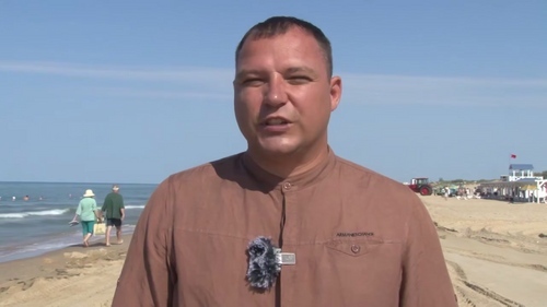 Публикация проиллюстрирована видеоверсией отчета Николая Заливина. За его спиной видна спецтехника, работающая на песчаном пляже, и группы отдыхающих, в том числе с детьми, на берегу и в воде.