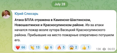 "Из-за атаки начался пожар возле хутора Васецкий Красносулинского района. Прибывшие на место пожарные оперативно потушили его", - написал он.