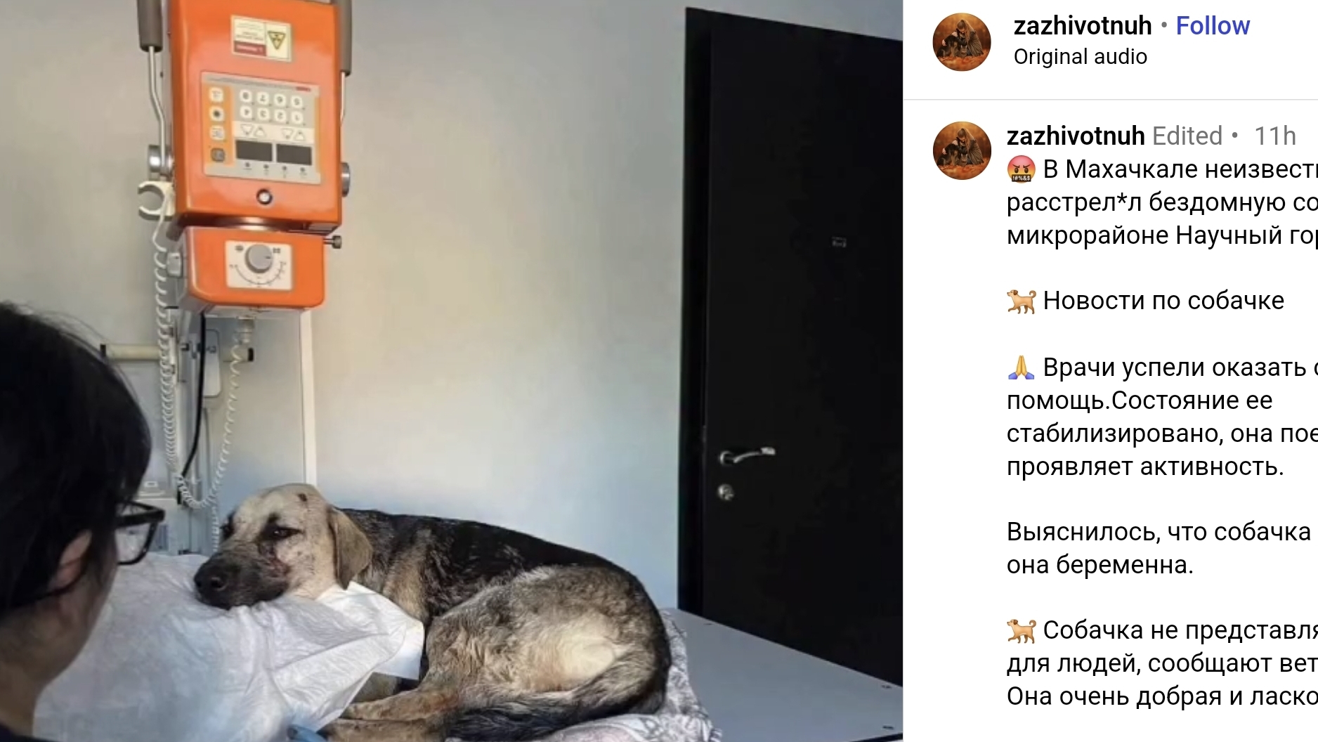 Собака, по словам зоозащитников, жива, хотя получила тяжелые ранения, одна из пуль застряла у нее в голове. Ветеринары, осмотревшие собаку, выяснили, что она беременна, охарактеризовав ее как "очень добрую и ласковую". "Собачка не представляла угрозы для людей, сообщают ветеринары", - говорится в сообщении Instagram*-паблика zazhivotnuh.