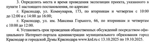 "Установить срок проведения общественных обсуждений посредством официального Интернет-портала администрации муниципального образования город Краснодар и городской Думы Краснодара www.krd.ru с 13.10.2025 по 19.10.2025", - говорится в постановлении администрации Краснодара от 26.09.2025 № 6028 "О назначении общественных обсуждений в муниципальном образовании город Краснодар", опубликованном 26 сентября на сайте мэрии.