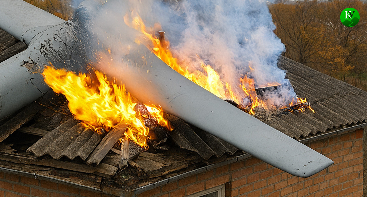 Около полуночи БПЛА упал на дом, разрушив крышу и вызвав пожар в строении. Осколочные ранения получили два человека. Прибывшая на место бригада скорой оказывает им первую медицинскую помощь. Расчеты пожарных тушат огонь.