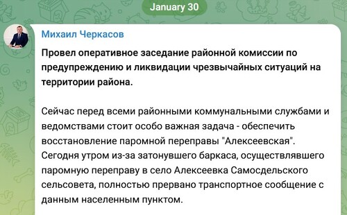 30 января глава района Михаил Черкасов отчитался в своем телеграм-канале, что провел оперативное заседание комиссии по предупреждению и ликвидации чрезвычайных ситуаций.