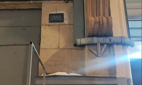 На стене у подъезда также остается трафаретная надпись, которая копирует текст с оригинальной мемориальной доски, следует из приложенных к публикации фотографий.