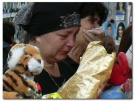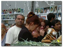 "Это самый трудный день после сентябрьских событий (захват заложников в школе №1 г. Беслана 1-3 сентября)", - призналась потерявшая тринадцатилетнего сына Сусанна Дудиева. Во дворе захваченной год назад школы собралось около двух тысяч человек, приехавших почтить погибших. Из здания школы, не прекращающиеся уже год, доносились стоны и крики женщин.