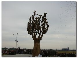 После оглашения длинного списка погибших, с мемориала, установленного на кладбище, было сдернуто белое полотно. Памятник "Древо скорби" скульпторов Заура Дзанагова и Алана Корнаева представляет собой ствол дерева, образованный четырьмя женскими фигурами, символизирующими все стороны света, поскольку сострадание трагедии, произошедшей в сентябре 2004 года в Беслане, выразил весь мир. Крону древа образуют распростертые руки женщин, которые держат ангелов, символизирующих погибших детей. Высота памятника - около 8 метров. Одновременно в небо вспорхнули белые голуби. "Покойтесь с миром, родные мои, - причитает по-осетински бабушка, стоя возле четырех могил. - Всю семью мне сгубили, хоть бы одного оставили".
