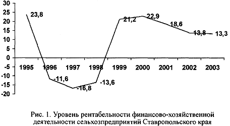 Низкий уровень заработной платы, высокая степень безработицы дополняются целым рядом социальных проблем, которые усугубляют состояние сельской бедности. На селе слабо решаются такие проблемы, как строительство жилья и дорог, газификация и телефонизация, финансирование здравоохранения и создание нормальных культурно-бытовых условий. Так, уровень благоустройства жилищного фонда в сельской местности края значительно ниже городского: канализацией в сельской местности снабжено 52% жилищного фонда (в городе - 80%), центральным отоплением - 50% (в городе - 83%), ваннами - 47% (в городе - 74%). Аналогичная ситуация наблюдается и в образовании. Так, на 1000 детей от 1 года до 6 лет мест в дошкольных учреждениях города 651, а в сельской местности на 18% меньше (543 места). В целом охват детей дошкольными учреждениями в городе составляет 50%, а в сельской местности - 42%. Продолжительность жизни в сельской местности края на 7 лет ниже, чем в городской, смертность населения на 6% выше, и за последние восемь лет уровень самоубийств возрос в 2 раза. Все перечисленные факторы привели к естественной убыли населения, и если до 1999 года в крае наблюдалось некоторое увеличение численности населения за счет превышения миграции, то в 2000 году естественная убыль превысила миграцию, а к началу 2003 года естественная убыль населения составила 12,2 тыс. человек, а миграционный прирост лишь 3,5 тыс. человек, т. е. в 3,5 раза меньше убыли. Сложившаяся ситуация с "бедностью" сельского населения в одном из самых богатых аграрных регионов России объясняется целым рядом макро- и микроэкономических факторов, носящих как объективный, так и субъективный характер. Прямая корреляция уровня бедности сельского населения наблюдается с финансовыми результатами деятельности сельскохозяйственных предприятий. Изменение уровня рентабельности финансово-хозяйственной деятельности сельскохозяйственных предприятий края представлено на рисунке 1.