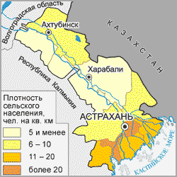 Численность населения большинства районов последние 20 лет оставалась относительно стабильной, за исключением растущих пригородов Астрахани (Приволжского района), Наримановского и особенно газодобывающего Красноярского района. Велики контрасты в заселенности сельской местности. Плотность сельского населения максимальна в пригородном Приволжском районе – 50 человек на кв. км, повышена она и в Икрянинском районе вдоль основной дороги в дельте Волги. На полупустынном севере Заволжья плотность составляет 2—3 человек на кв. км, как в Сибири (рис. 1).