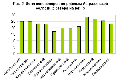 Отличия возрастной структуры жителей области от среднероссийской невелики, они связаны со смешанным национальным составом и большим миграционным притоком. Более 61% составляет трудоспособное население (в среднем по РФ – 59%), доля жителей старше трудоспособного возраста – 19% (в РФ – 21%). Больше всего пенсионеров в южных сельских районах (рис. 2), а минимум – в наполненном строителями и приезжими рабочими Красноярском районе, где расположен Астраханский газоконденсатный завод.