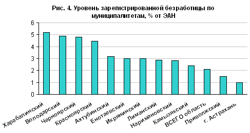 Зарегистрированная безработица в 2003 г. составила 2,2% от численности экономически активного населения. Наиболее благополучна Астрахань, где уровень безработицы не превышает 1% и на каждого безработного приходится одно вакантное рабочее место. В слаборазвитых районах зарегистрированная безработица в 4—5 раз выше, но такой же показатель безработицы имеет и самый богатый Красноярский район (рис. 4). Новых рабочих мест очень мало, поэтому на одну вакансию в слаборазвитых районах приходилось в 2003 г. 181—460 безработных. Разрушение общественного агросектора привело к тому, что сельская безработица стала серьезной проблемой, но ее реальный уровень оценить сложно. Часто те, кто числится безработными, имеют немалые заработки от своего подсобного хозяйства и браконьерства.