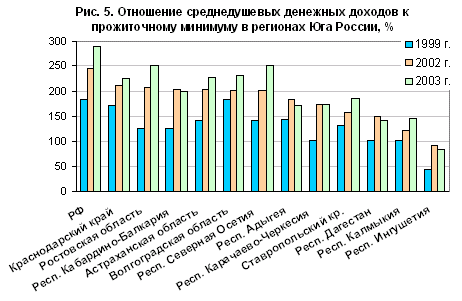 В период экономического роста реальные среднедушевые денежные доходы населения Астраханской области возросли более чем на 47% (2002 г. к 1999 г.). В отличие от слаборазвитых республик, где рост доходов был обусловлен увеличением федеральной помощи, в Астраханской области это результат реального оживления экономики, роста доходов нефтегазовой отрасли, развития транспортных функций. Однако по отношению душевых денежных доходов к прожиточному минимуму область отстает от среднероссийского показателя и не отличается от других "русских" регионов юга и наиболее развитых республик Северного Кавказа (рис. 5).