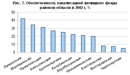 Рис. 7. Обеспеченность канализацией жилищного фонда районов области в 2002 г.