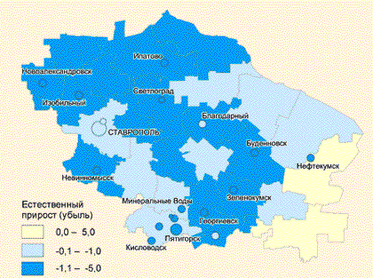 Благодаря поздней урбанизации и "омолаживающему" эффекту миграционного притока Ставропольский край только в последнее десятилетие переживает схожие с Россией демографические проблемы. Начиная с 1993 г. в крае отмечается естественная убыль населения, но пока ее глубина меньше не только по сравнению с регионами Центральной России, но также и с соседними регионами равнинного Предкавказья, где эта проблема проявилась раньше и выражена глубже. Однако с каждым годом масштабы депопуляции в Ставропольском крае все менее существенно уступают соседним регионам: в 2002 г. коэффициент естественной убыли в крае составлял –5,1 промилле, в соседнем Краснодарском крае –5,8 промилле, в среднем по стране –6,5 промилле.
