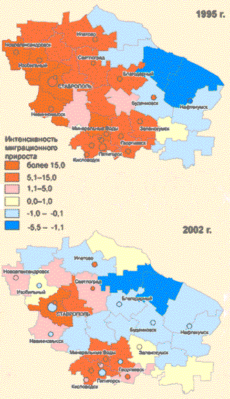 Рис. 3. Миграционный прирост населения в Ставропольском крае в 1995 и 2002 гг.