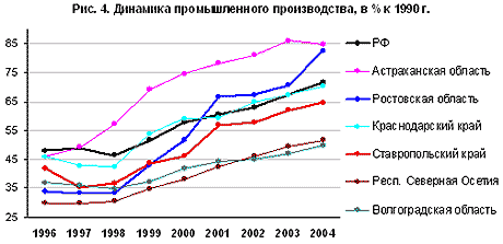 Аграрно-индустриальный характер экономики края виден из структуры ВРП: доля промышленности (22%) заметно ниже, чем в среднем по РФ (33%), зато доля сельского хозяйства (17%) в 2,5 раза выше среднероссийской. Промышленность края остается проблемной зоной экономики, динамика производства в переходный период была худшей и по сравнению со среднероссийскими показателями, и по сравнению с соседними регионами. В период спада объем производства в крае сократился так же сильно, как в Ростовской области, но при этом восстановительный рост был более медленным (рис. 4).