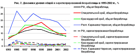 Рост численности населения и более узкий рынок труда стали основными факторами повышенной безработицы, характерной для большинства южных регионов. В Ставрополье общая безработица в течение всего переходного периода была выше среднего показателя по РФ (рис. 7). По сравнению с республиками Северного Кавказа край находится в лучшем положении, но, как и в республиках, проблема занятости во многом решается с помощью самозанятости и трудовой миграции, а не создания новых рабочих мест.