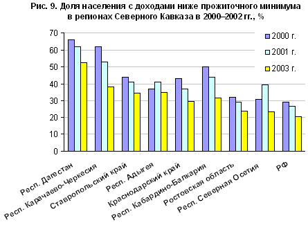 Рис. 9. Доля населения с доходами ниже прожиточного минимума в регионах Северного Кавказа в 2000-2003 гг.