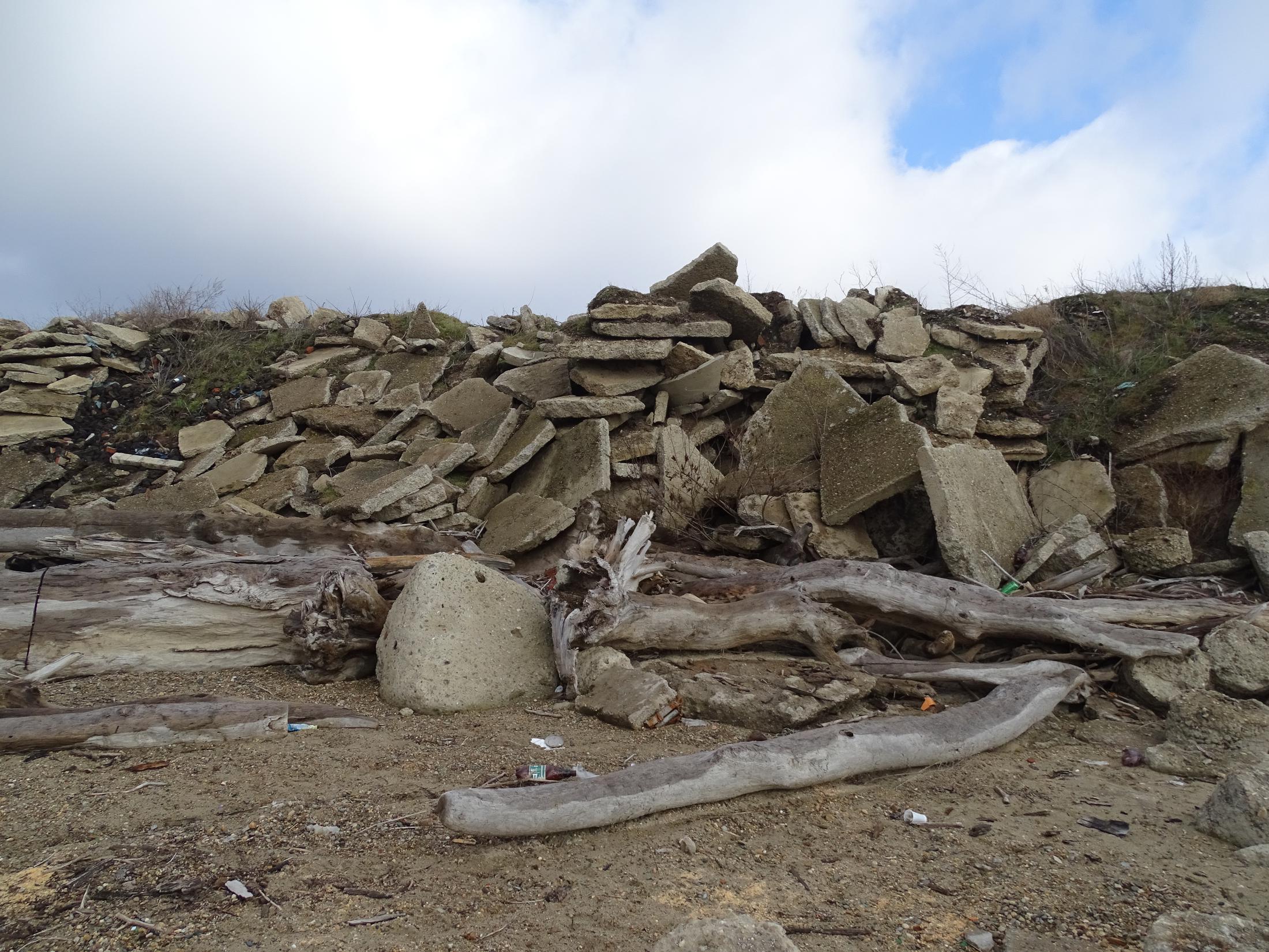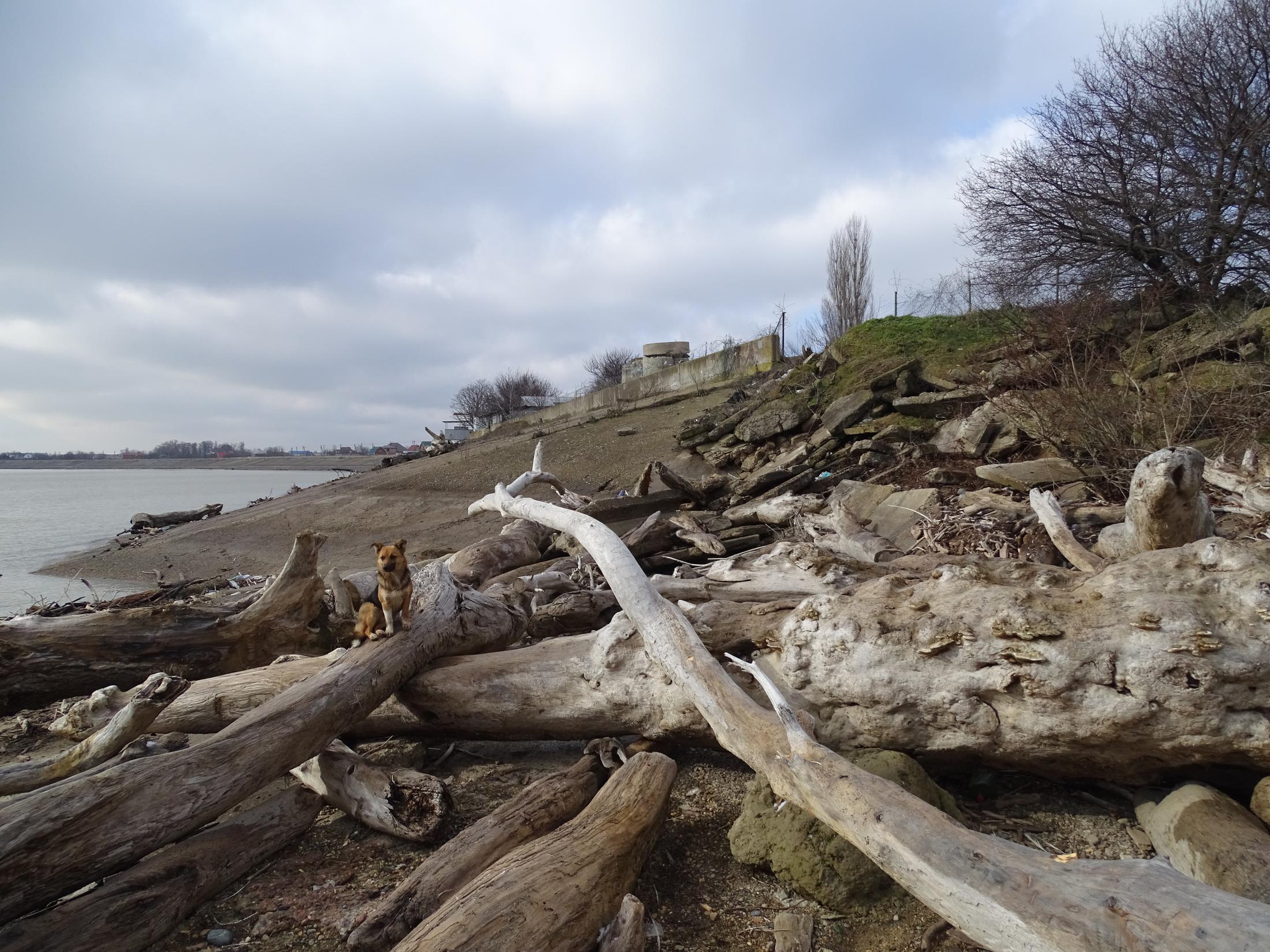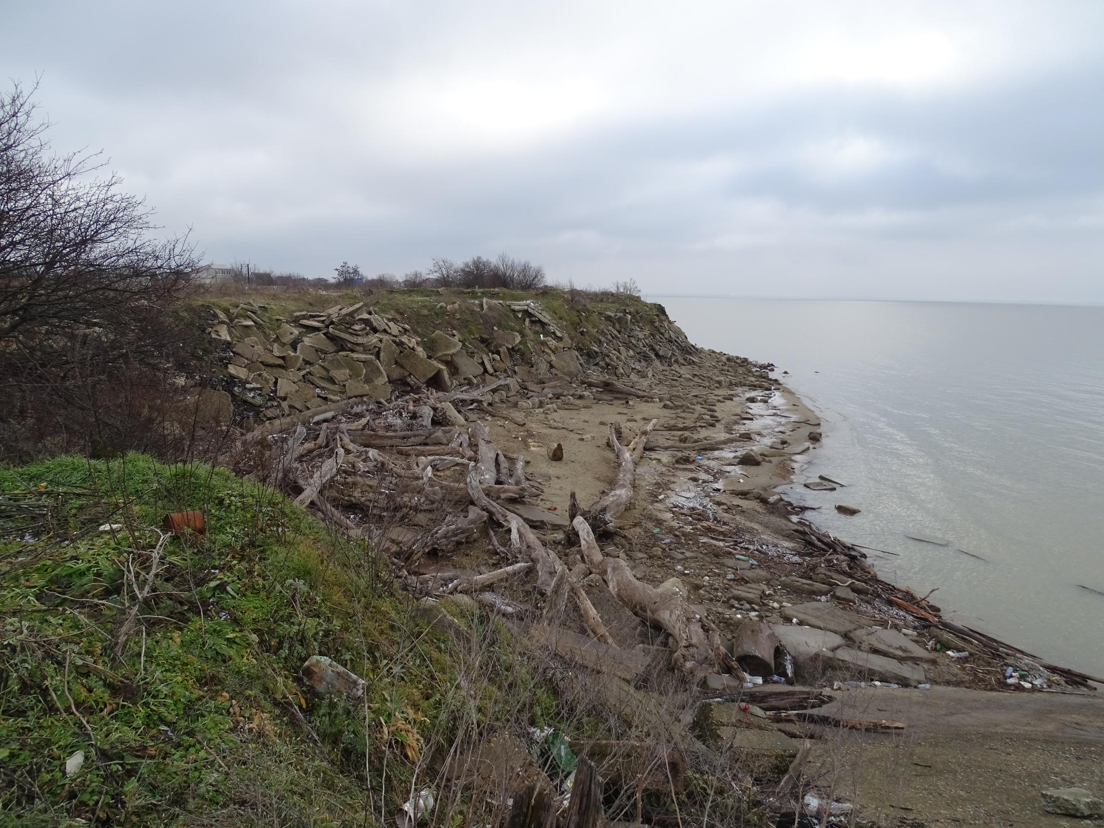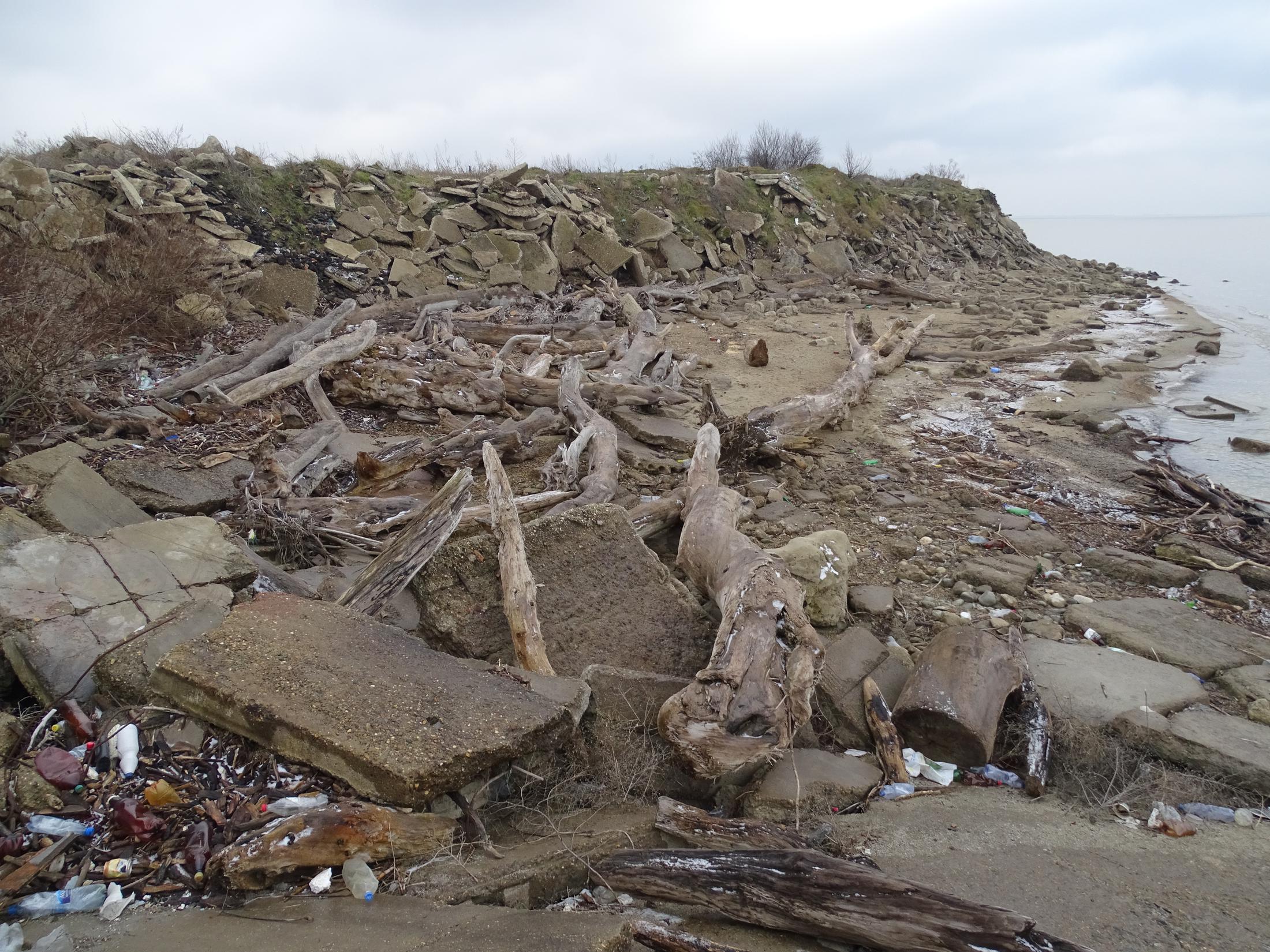 Краснодарское водохранилище, разрушенные бетонные плиты дамбы водохранилища и его замусоренный берег. Затопленные деревья приносят в водохранилище Кубань, Лаба и другие реки. Мусор, сучья и деревья выбрасывает на берег «Кубанского моря». Инспекция «ЭкоВахты» берега Краснодарского водохранилища со стороны хутора Ленина, 2017 год. Фото предоставлено «Кавказскому узлу» Андреем Рудомахой