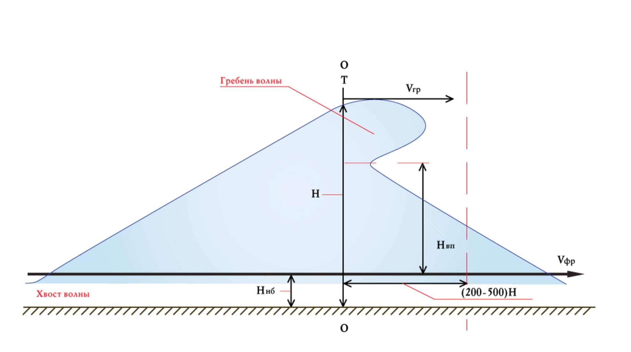 Волна прорыва образуется во фронте потока воды, которая устремляется с большой скоростью в прорыв плотины. Приведенная схема показывает, что волна представляет собой движение водного потока с изменяющимися во времени характеристиками — глубиной, шириной, уклоном поверхности и скоростью течения. Для определения высоты волны прорыва (Hвп) у тела плотины — так называемого нулевого створа — используются такие характеристики, как глубина водохранилища у плотины (H) в метрах и высота нижнего бьефа (Ннб) — части водохранилища, примыкающей к гидротехническому сооружению с другой стороны плотины. Гребень и фронт волны — соответственно верхняя и передняя часть потока — имеют определенную скорость движения. Эти параметры, обозначенные на схеме как Vгр и Vфр, напрямую влияют на поражающую способность волны11.