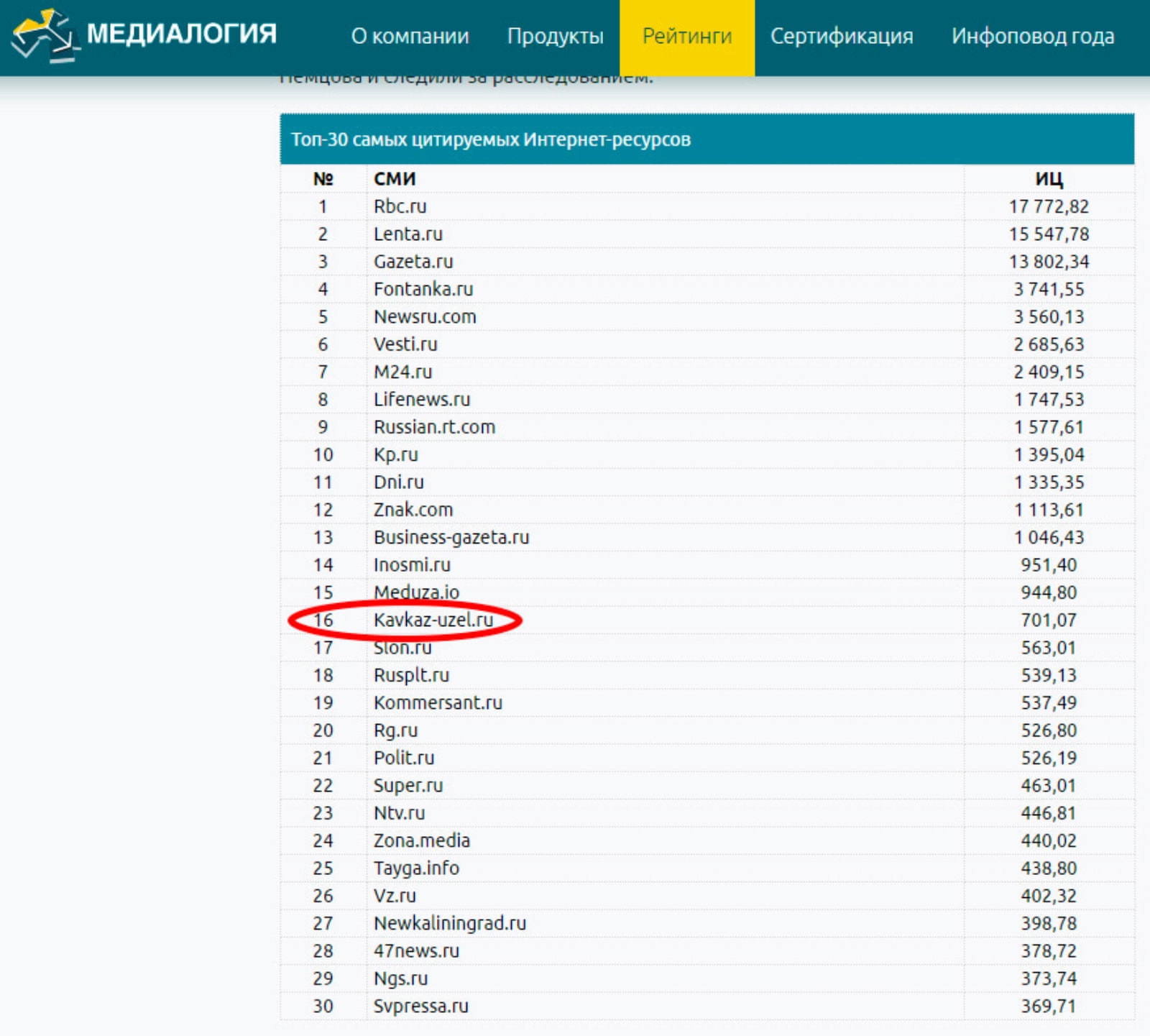 По данным Яндекс — 1 место по цитируемости среди СМИ Северного Кавказа и Юга России.